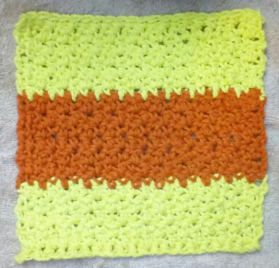 Today I'm sharing a very easy pattern. I've used two colors, but you can just use one, or use as many as you like. The finished dishcloth measures about 7 inches wide and 6 1/2 inches long. The gauge is 20 stitches and 19 rows per four inches using a size G/4.25mm hook. The gauge really isn't that important for this pattern, and you can use a larger or smaller hook if you'd like a looser or tighter fabric.